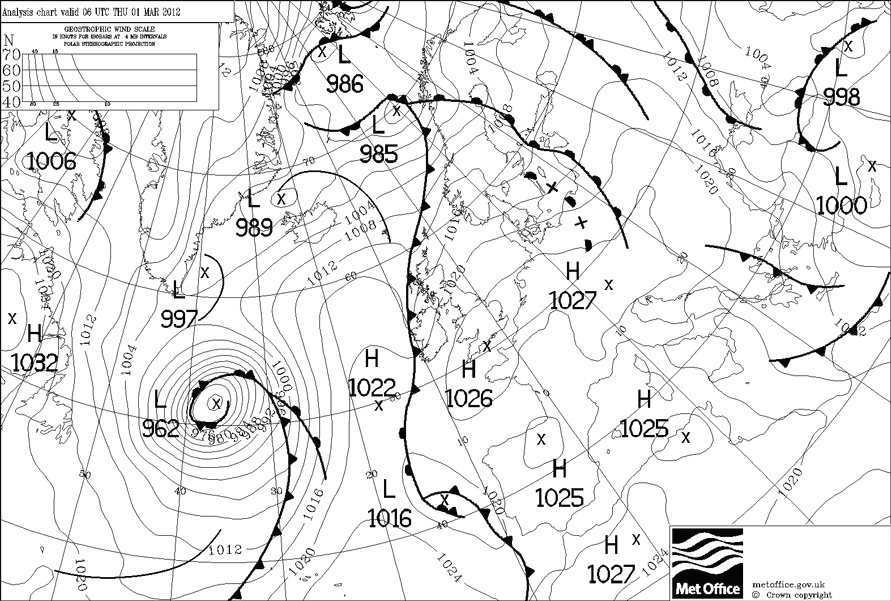Surface analysis chart for 0600 UTC on 1 March 2012. An anticyclone is centred over Lyme Bay with very light winds across southern England, UK.