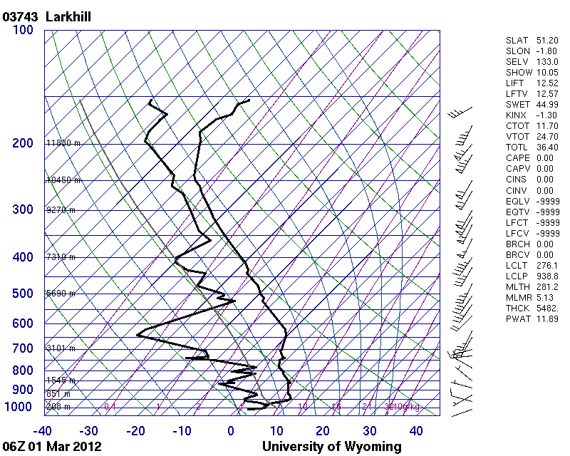 This is the 0600 UTC upper air sounding from Larkhill, England, UK on 1 March 2012. A strong inversion is present at about 200 m, associated with strong nocturnal radiative cooling. The air is saturated at and below the level of the inversion. Above the inversion, the air is much drier.