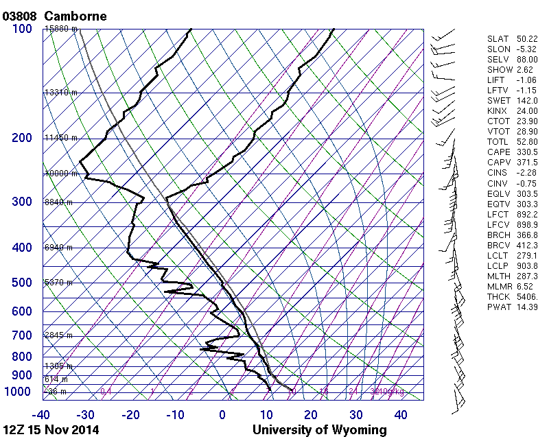 The sounding from 14 km to the north-east shows an atmosphere that is unstable from the surface to 925 hPa and conditionally unstable from 925 hPa to the tropoause at 291 hPa.